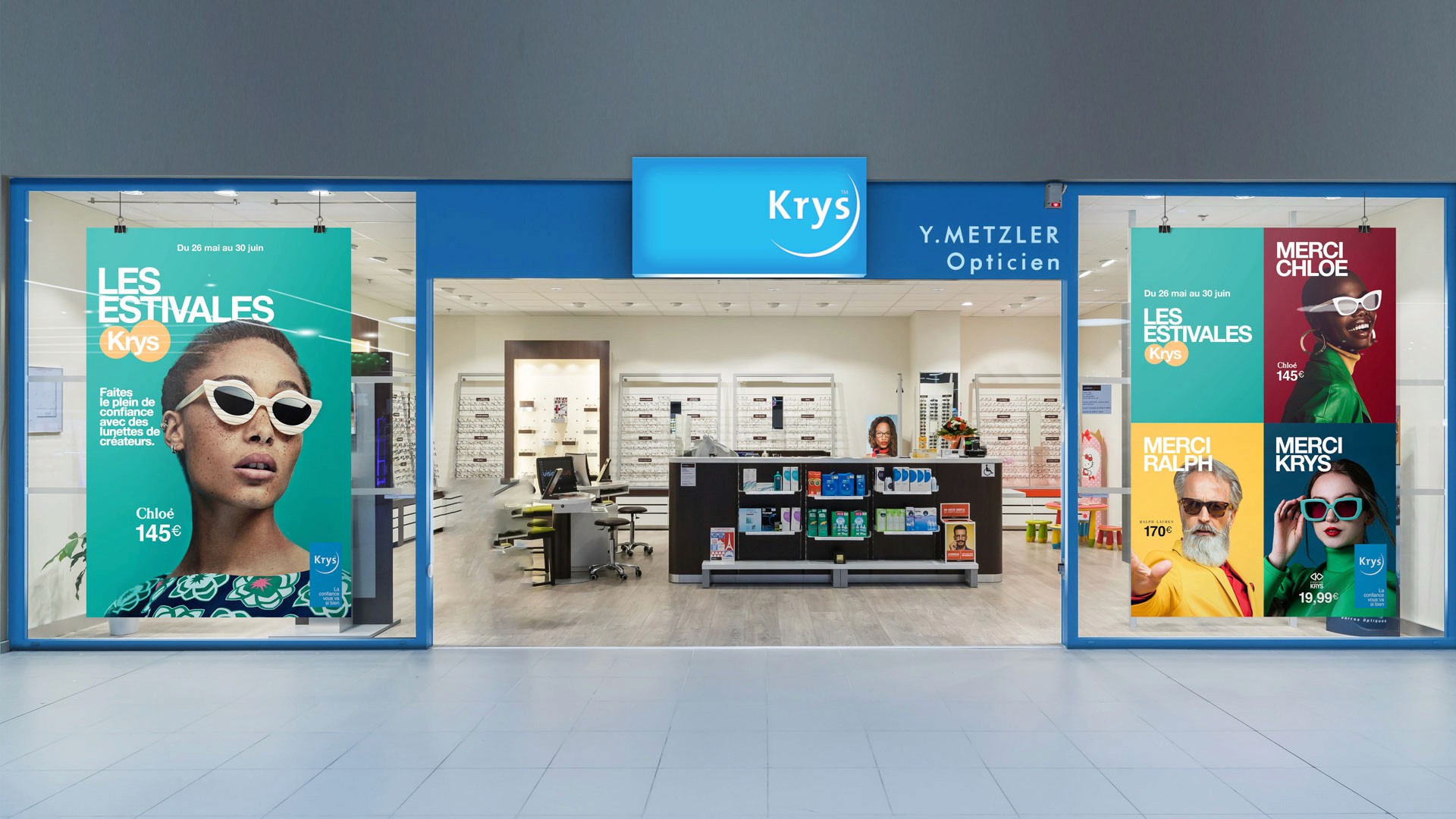 Conception créative, direction artistique et maquettage pour la campagne estivale de Krys. Mise en avant des solaires de grands créateurs avec une communication pensée pour séduire la cible millennial.